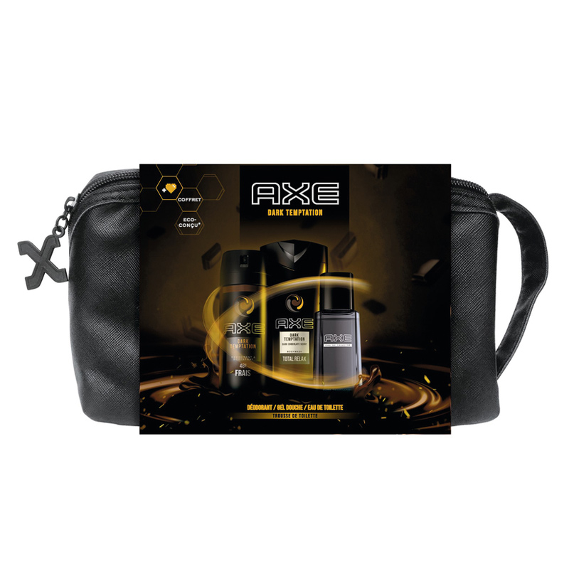 Coffret DARK TEMPTATION comprend un déodorant 150ml, une eau de toilette 100ml et un gel douche 250ml + une trousse de toilette en similicuir noir.
