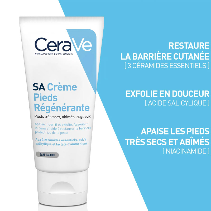SA Crème Pieds Régénérante CeraVe contient 3 types de céramides, des lipides indispensables pour protéger la peau, notamment contre l’assèchement par évaporation. Elle participe à la restauration de la barrière cutanée et à la cicatrisation des crevasses. Grâce à ses agents réparateurs, cette crème apporte souplesse et élasticité aux peaux fragilisées. SA Crème Pieds Régénérante CeraVe renferme de l’acide salicylique, dont les propriétés kératolytiques permettent une légère exfoliation de la couche externe de la peau. Elle contribue à ramollir la corne et à lisser la surface de la peau écailleuse, sans sensation de tiraillement. Composé de lactate d’ammonium et de glycérine, ce soin humectant est idéal pour rétablir le niveau d’hydratation de la peau rugueuse et aide à soulager les irritations dues aux frottements des pieds dans les chaussures.