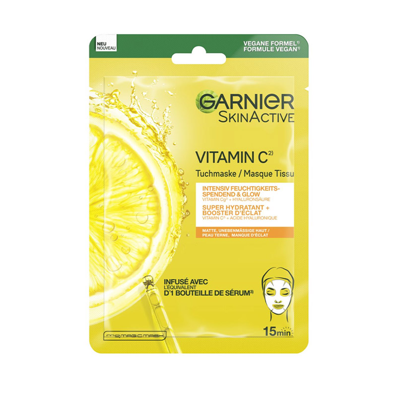 Un soin super hydratant & booster d’éclat qui agit en seulement 15 min. Le masque en tissu à la vitamine C de Garnier illumine et repulpe votre peau. Ce masque a été imprégné d’une formule illuminatrice concentrée en Vitamine C et en Acide Hyaluronique pour une hydratantion intense de votre peau. Son incroyable fraîcheur désaltère, réconforte et illumine instantanément votre peau, pour un vrai moment de bien-être. Après 1 semaine : le teint est plus uniforme, les signes de fatigue sont réduits et la peau semble revitalisée. Infusé avec l’équivalent d’un flacon de sérum, il est idéal pour les peaux ternes et en manque d’éclat.