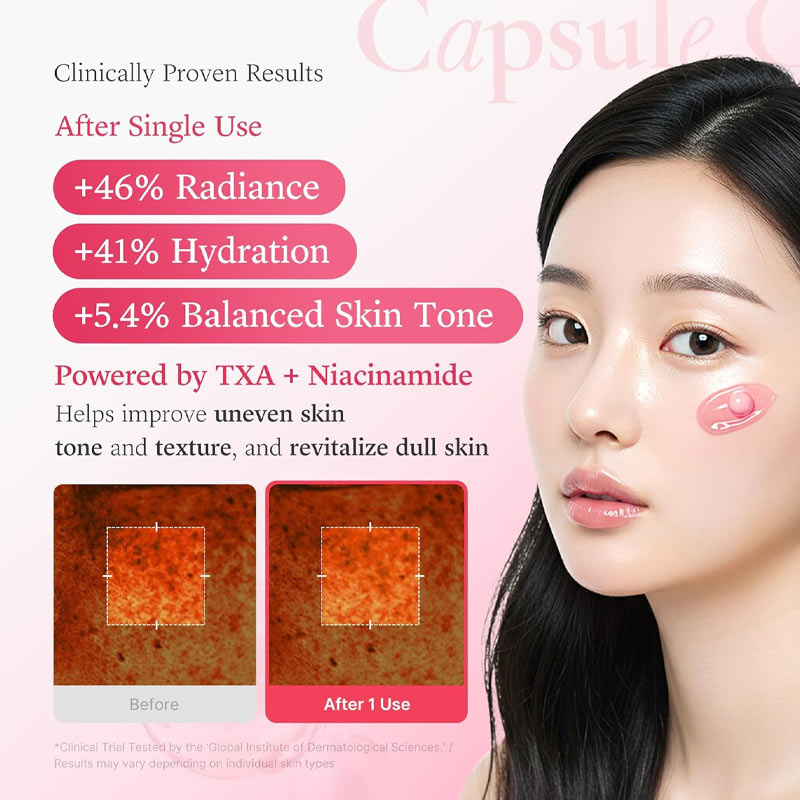 – Éclaircissement du teint: Le TXA et la niacinamide agissent ensemble pour réduire les taches pigmentaires et unifier le teint.